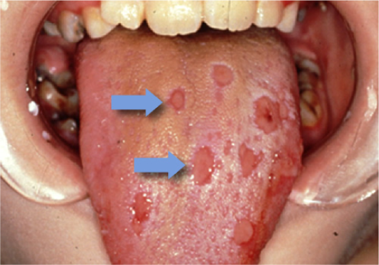 アフタ性口内炎;円形や類円形で、潰瘍面は白色や灰白色の付着物で覆われており、周囲に発赤が取り囲んでいる。1週間程度で改善する場合が多い。(悪性腫瘍では何カ所も出来ない)
