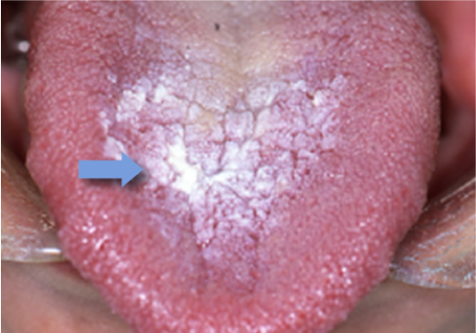 カンジダはもともと口腔常在菌であり、免疫力の低下や抗菌剤、ステロイドの内服など、いくつかの要因が重なり発症します。ご高齢の方や乳幼児に多いです。好発部位は、頬粘膜、舌、口蓋などです。表面の乳白色の苔は、ガーゼやティッシュでぬぐい取ることが出来ます。自覚症状が少ない場合が多いですが、疼痛を伴う場合は薬剤による治療が必要です。