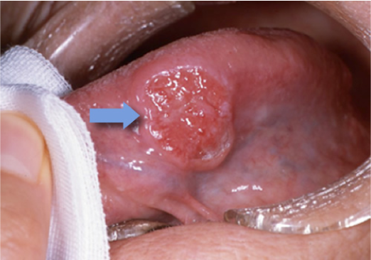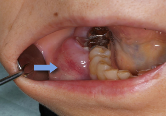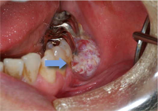 歯肉に出来る悪性腫瘍は、下顎が多く、有歯顎(歯のある方)臼歯部(奥歯)によく発生します。疫学的には男性が多いです。無歯顎(歯が全くない方)の患者さんも多いです。口腔に発生するがんの20%弱程度は歯肉がんです。